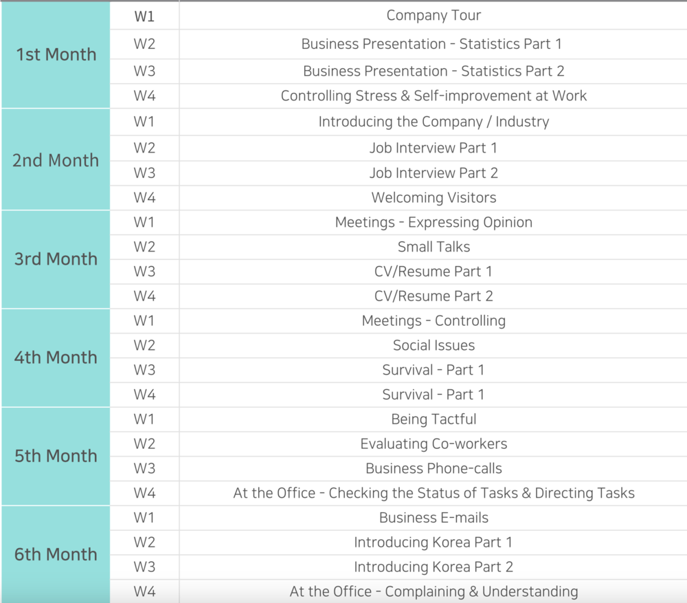 - 총 60개의 이메일 패턴, 토픽 별로 구성된 자체 교재를 활용한 6개월 완성 코스